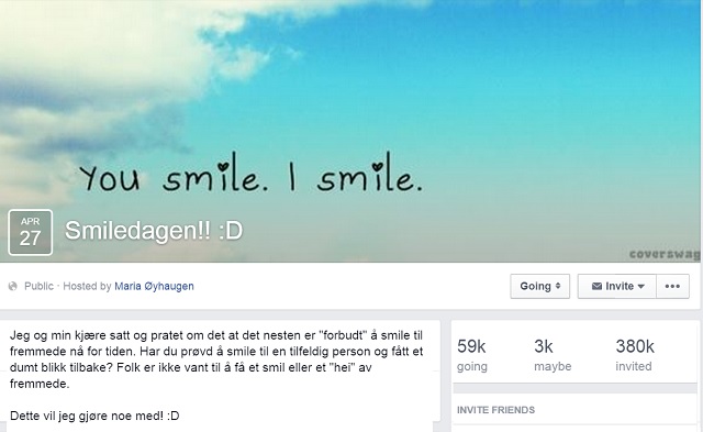 Norwegian Maria Øyhaugen started Facebook event calling people to smile to strangers. The event has attracted almost sixty thousand participants in a very short time. The event page wrote as follow: